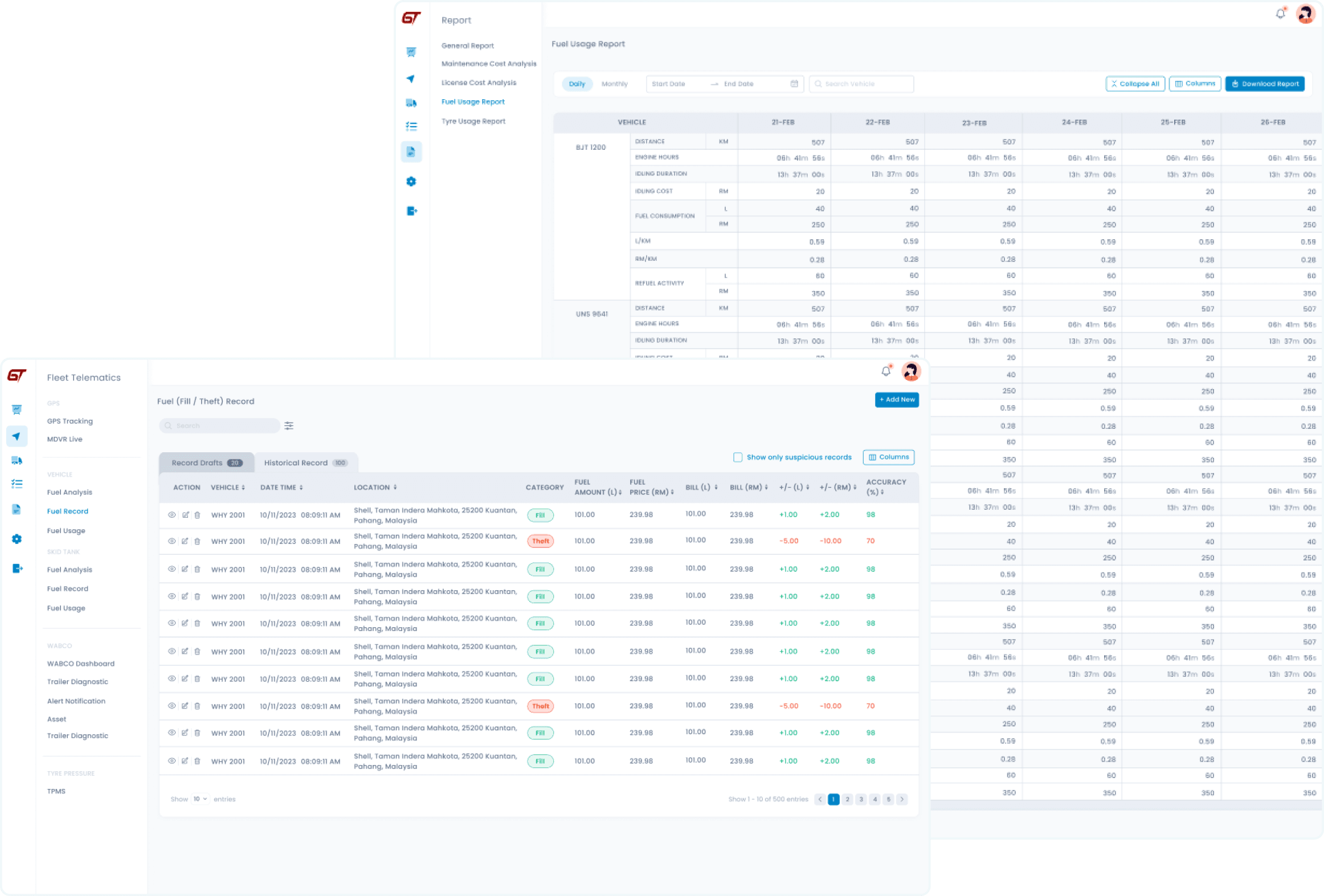 Ability to monitor fuel consumption live, detecting any abnormality of fuel, tracking filling activity location and volume.